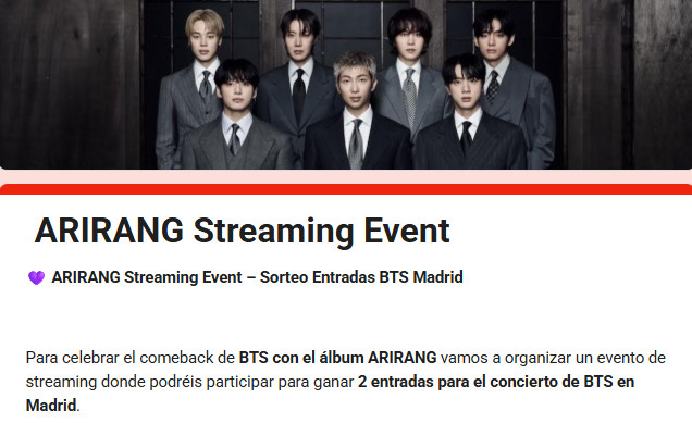 Es el momento de demostrar la fuerza de ARMY España. Regístrate, comparte y empieza a sumar puntos. ¡Nos vemos en el concierto!