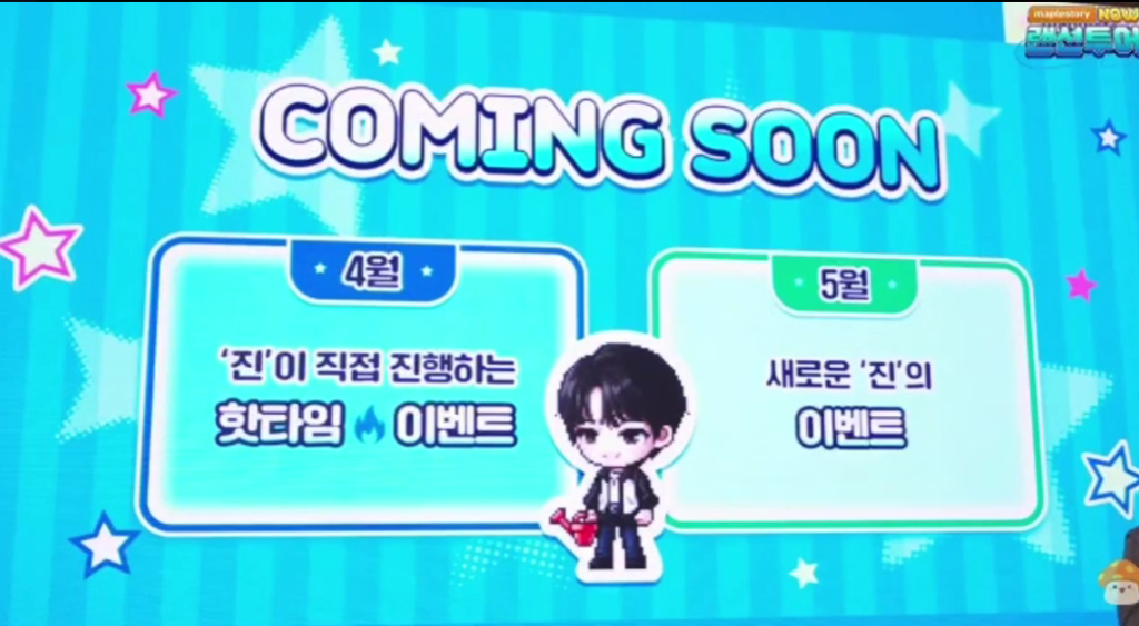 • Mayo: El evento más interactivo. Seokjin entrará físicamente al juego para viajar por el mundo de MapleStory. Los jugadores que logren encontrarse con su avatar recibirán recompensas exclusivas y únicas.