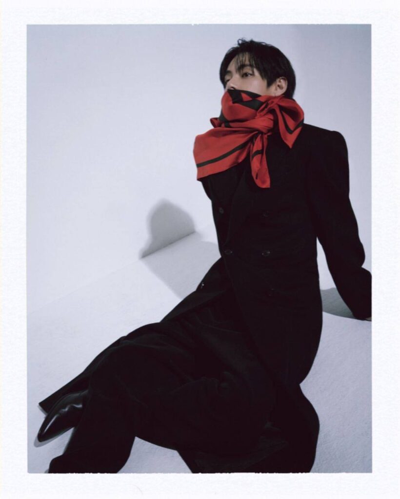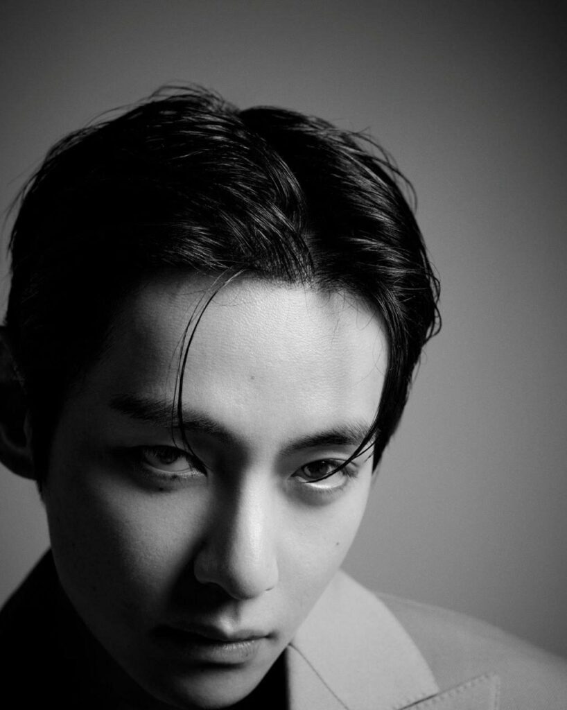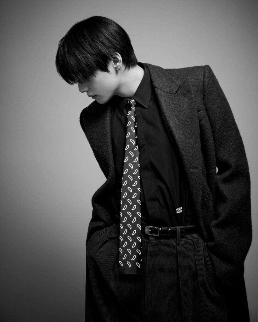 • Sastrería clásica: V aparece con trajes oscuros perfectamente entallados y corbatas estampadas, reforzando su imagen de icono de la moda masculina.